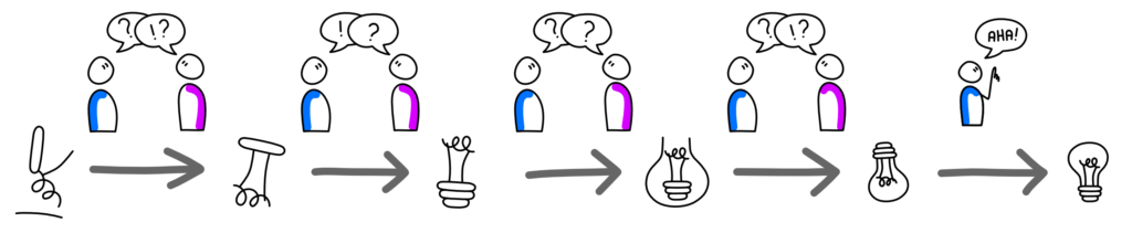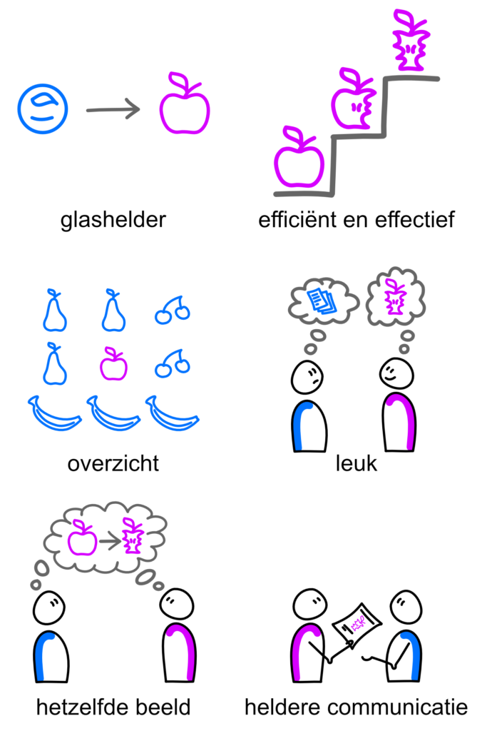 - Ontwikkelprocessen worden efficiënter en effectiever omdat een visualisatie in wording werkt als een heel heldere conclusie waar je gezamenlijk steeds verder op kunt bouwen. Zonder steeds stapjes terug te hoeven doen omdat er een wollige conclusie “in de lucht hangt” waar iedereen ook nog eens zijn eigen invulling aan geeft.