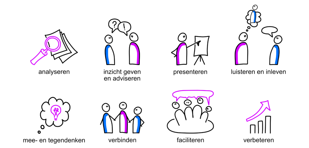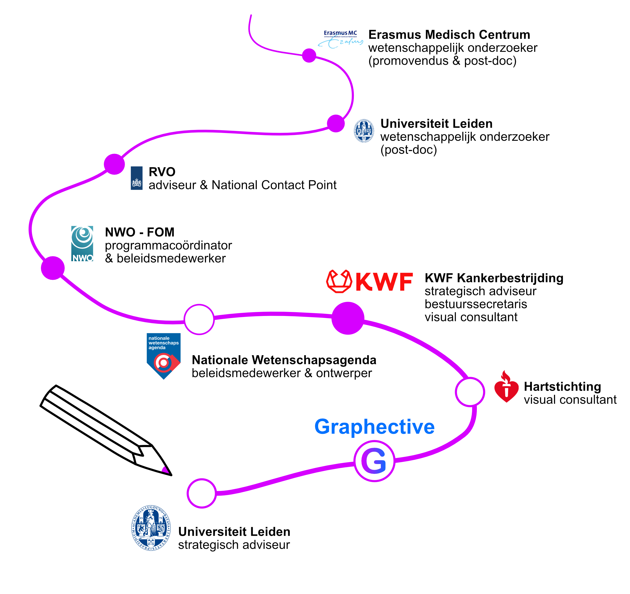 Ik heb een achtergrond als wetenschapper en veel ervaring als adviseur in de wereld van nationale en internationale onderzoeksfinanciering en beleidsontwikkeling op uiteenlopende gebieden. Deze ervaring heb ik opgedaan binnen de overheid, semi-overheid en gezondheidsfondsen (zie hiernaast). Toen ik in 2018 een loopbaancoaching traject volgde bleek dat het gebruik van uiteenlopende vormen van visualisaties als een rode draad door mijn loopbaan loopt. Dat was het moment waarop ik besloot mij verder te ontwikkelen als visual consultant en visualisaties in te zetten om complexe informatie te doorgronden. Met daarbij mijn kennis, ervaring en een brede interesse ben ik thuis in een groot aantal onderwerpen of kan ik mij daar heel snel in verdiepen. Dit maakt mij ook inhoudelijk een waardevolle gespreks- en sparringspartner naast mijn vaardigheden als “visualisator”. In 2020 startte ik Graphective om zo ook naast mijn vaste aanstelling andere organisaties te kunnen ondersteunen als freelancer. Daarbij zet ik met veel plezier mijn vaardigheden (zie hieronder) in voor een optimaal resultaat.